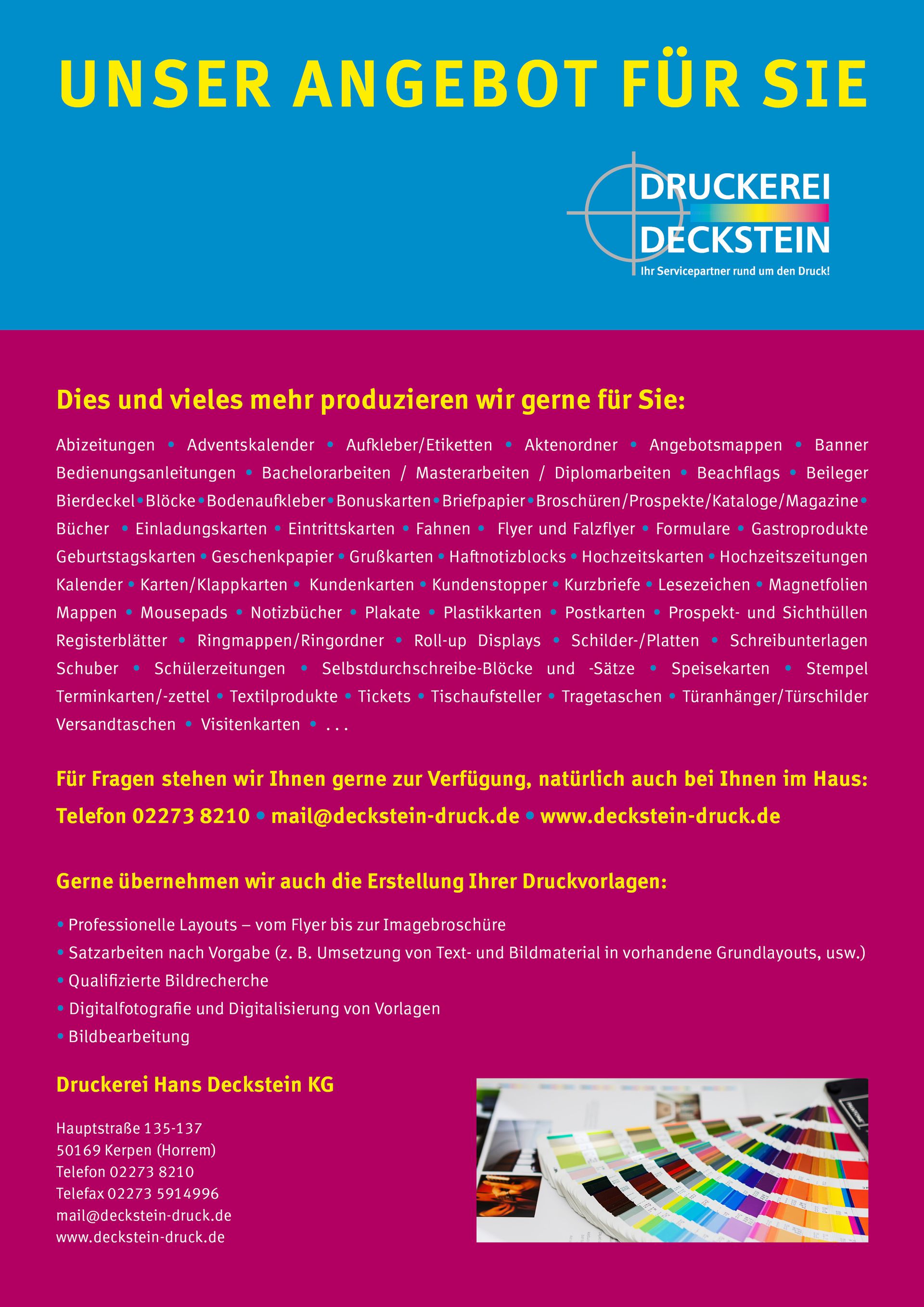 Abizeitungen • Adventskalender • Aufkleber/Etiketten • Aktenordner • Angebotsmappen • Banner • Bedienungsanleitungen • Bachelorarbeiten / Masterarbeiten / Diplomarbeiten • Beachflags • Beileger • Bierdeckel • Blöcke • Bodenaufkleber • Bonuskarten • Briefpapier • Broschüren/Prospekte/Kataloge/Magazine • Bücher • Einladungskarten • Eintrittskarten • Fahnen • Flyer und Falzflyer • Formulare • Gastroprodukte • Geburtstagskarten • Geschenkpapier • Grußkarten • Haftnotizblocks • Hochzeitskarten • Hochzeitszeitungen
